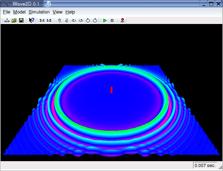 The simulation tool "Wave2D" available on this site is a product of this development. This tool simulates an extended version of the so called wave equation in two spatial dimensions (2D) and visualizes this wave fields by 3D animations, realized with an OpenGL® interface. Detailed information and program download are available at