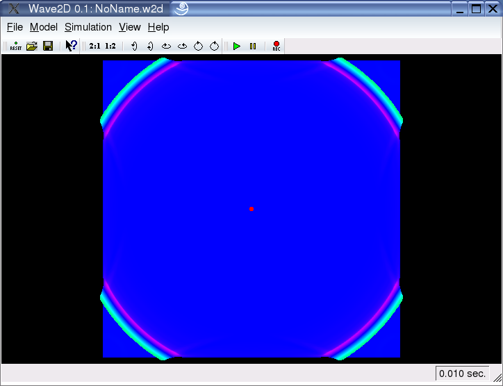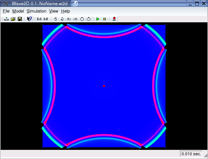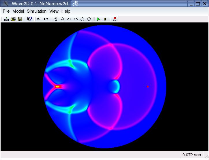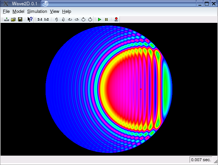 Circular geometries play a special role in "Wave2D". In fact, circular models are membrane models. The visualized outcome is the deflection of this membrane, rather than the speed of the membrane (equivalent to pressure in room acoustics) as it is for rectangular models, and the boundary conditions are always supported for circular models compared to free boundary conditions for rectangular models. Together with the additional physical effects dispersion (resistance against bending) and frequency dependent and frequency independent damping, one can achieve a realistic drum model. The screenshots depict a simulation of the pure wave equation on the left (a thin membrane for instance), and a simulation of a strong dispersive material (a metal for instance) on the right.